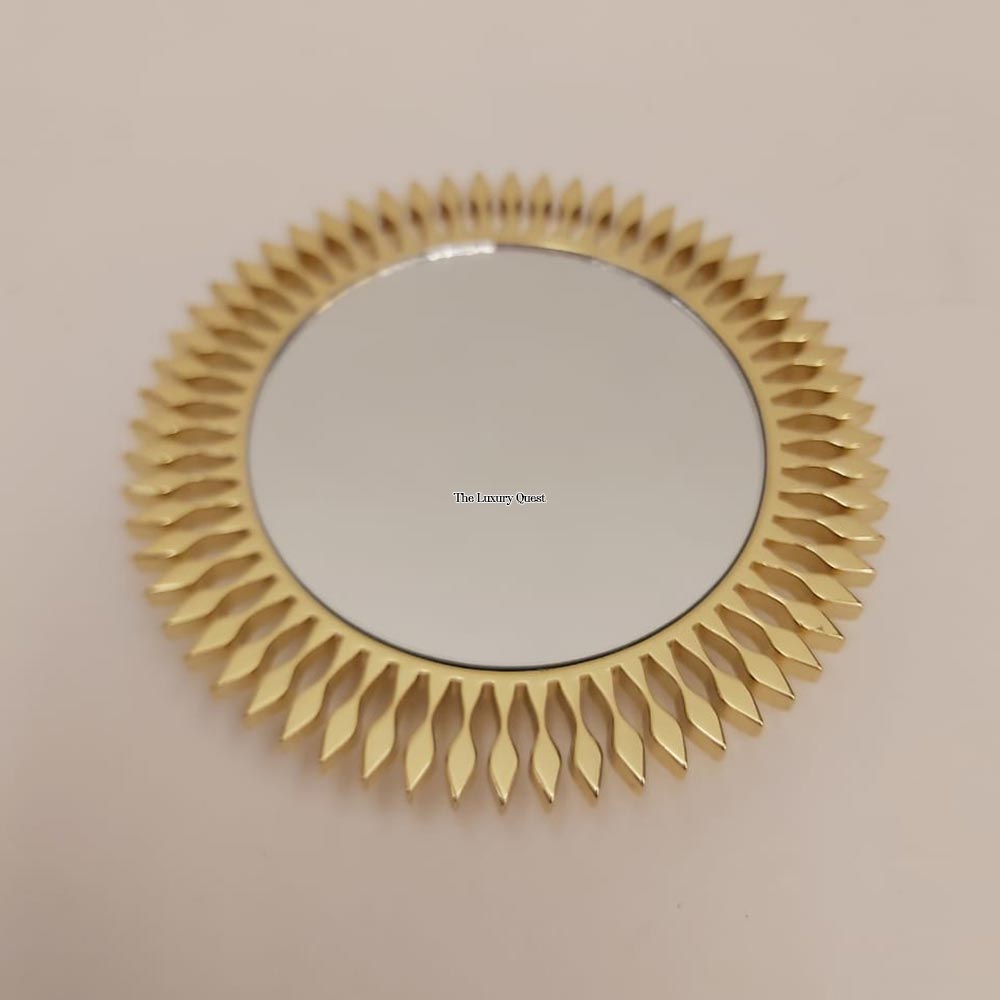 This gold toned mirror has logo embossed at the back. It features finger loop for improved grip than can also be used as a stand for the mirror.