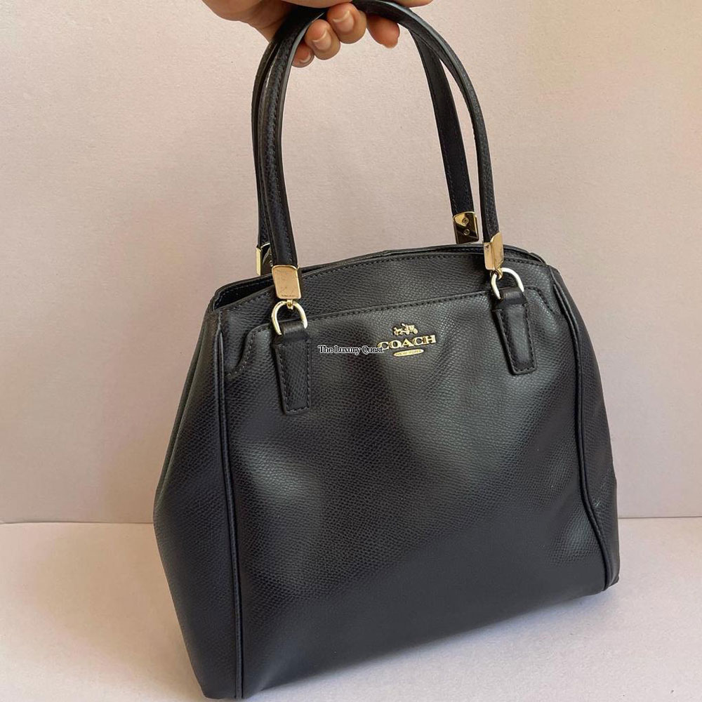 Made from saffiano leather with sleek gold-tone hardware. Brand logo is featured on the front flap which comes with a push lock closure. This bag can go from day to evening.