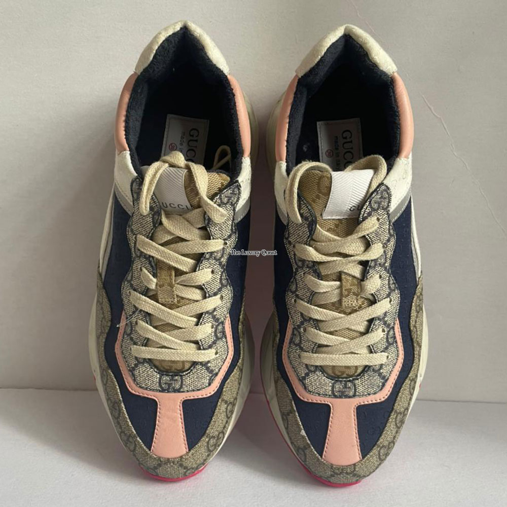 These sneakers are made in beige/ebony and beige/blue GG canvas and white/blue mini GG jacquard fabric with pink leather trimmings. It is defined by a thick sole and a chunky construction. The Rhyton sneakers provide comfort and are perfect to amp up your look.