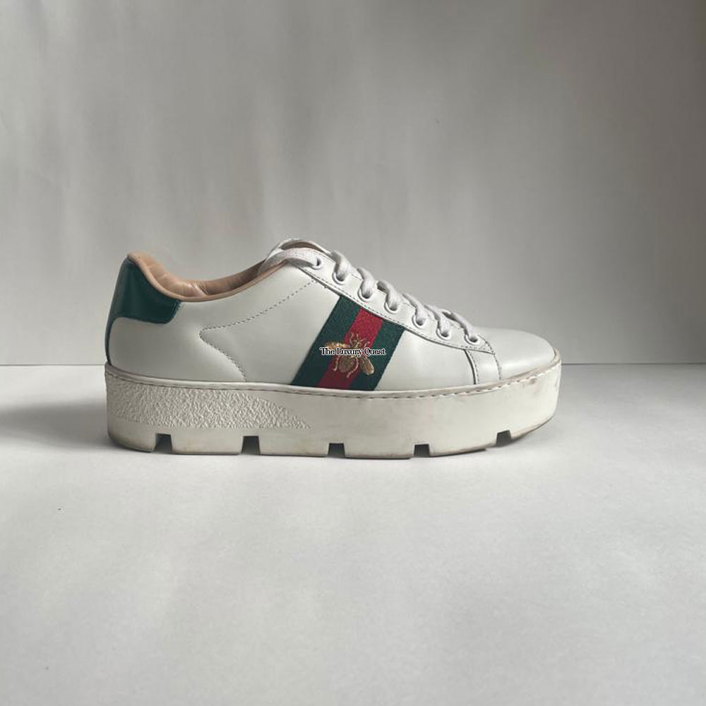 Made from white leather with green and red web and gold thread-embroidered bee. Red metallic leather detail on the back of one shoe and green metallic leather detail on the back of other. It features 45mm platform height and is a very versatile style.