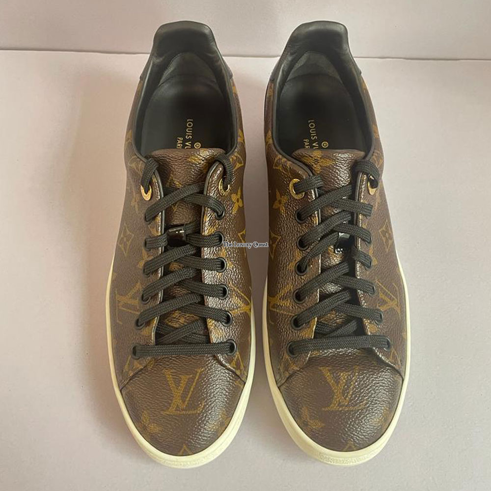 Made from the iconic monogram canvas with black patent leather trimmings and subtle gold metal details. This item comes with a dust bag and a box. Shop this stylish pair only at www.theluxuryquest.com