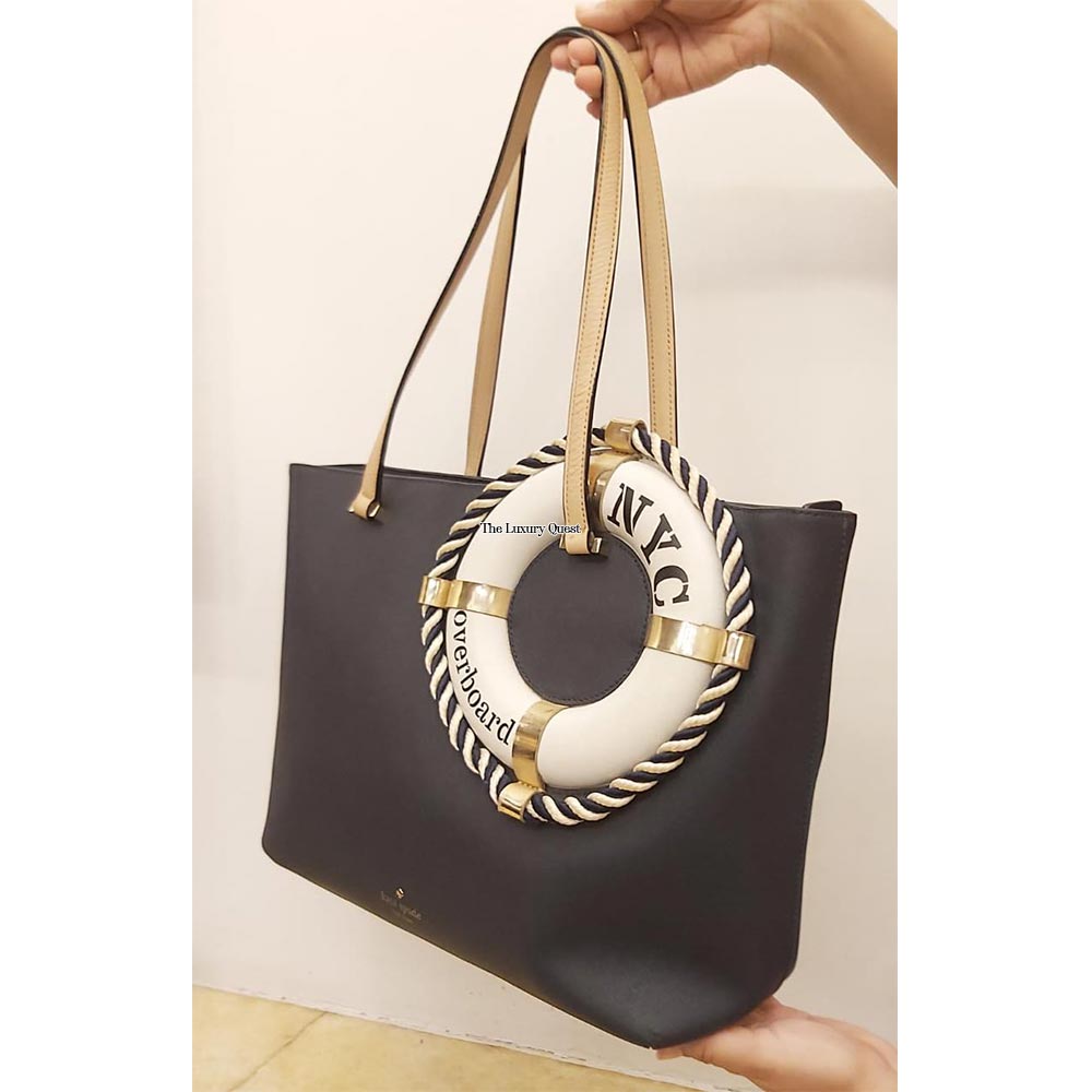 Made from navy blue saffiano leather with gold-tone hardware and dual flat shoulder straps in beige. It features a leather life preserver adornment with braided trim and “NYC Overboard” lettering on it. The interior consists of stripe nylon lining and pockets.
