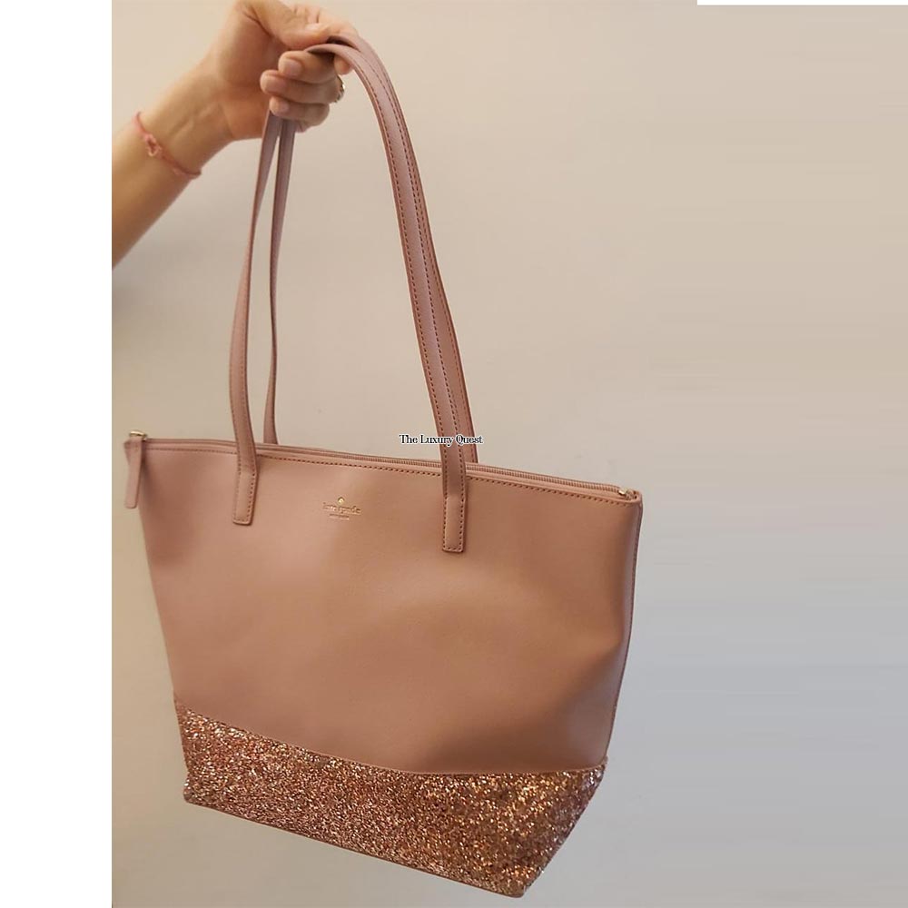The tote is made saffiano pvc with over the shoulder handles and top zip closure. It comes with jacquard lining and is spacious enough to fit in a all your essentials.